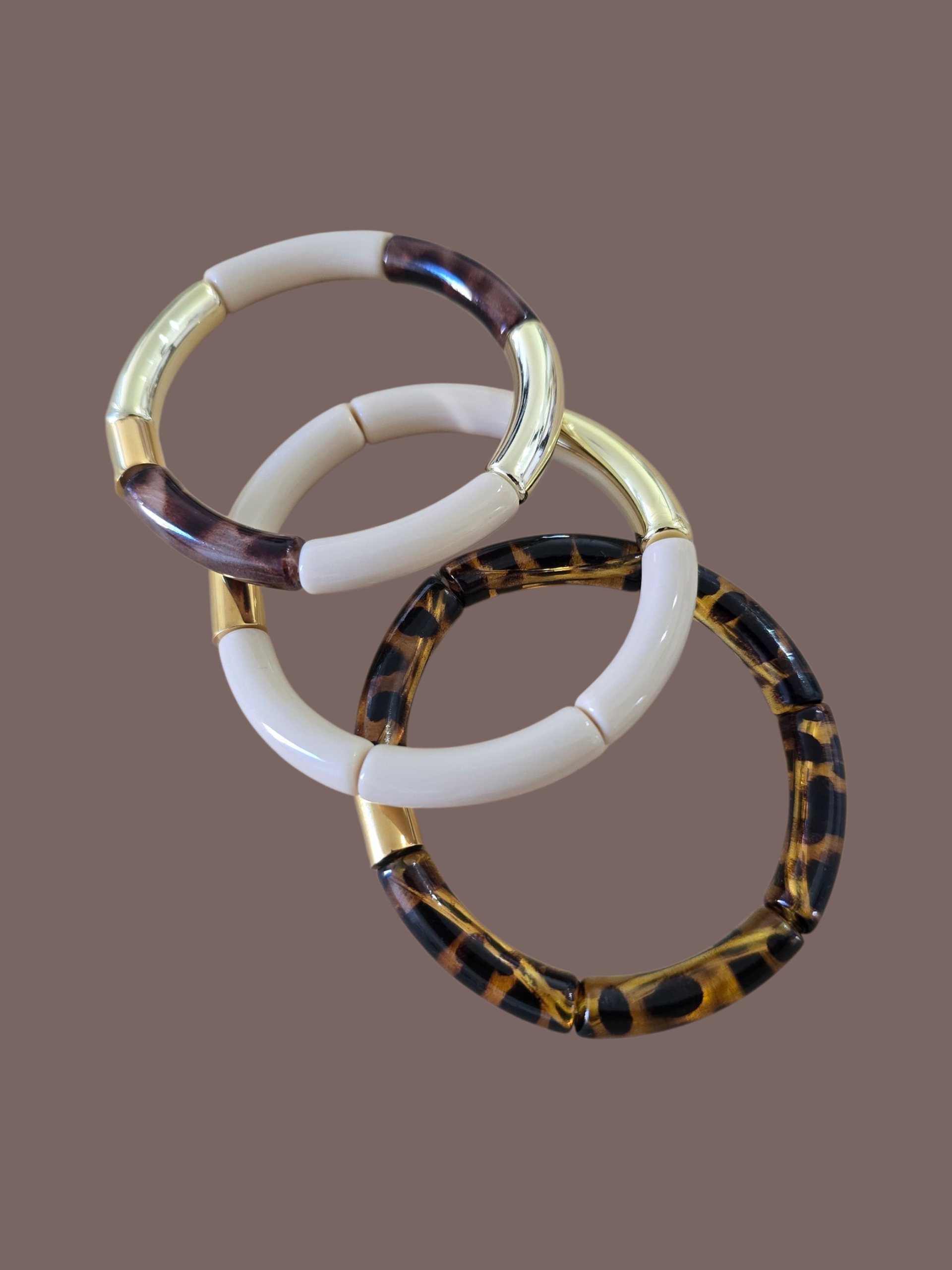 Les bracelets sont composés de 6 perles en acrylique et d'une perle gravée Lisso en acier doré.