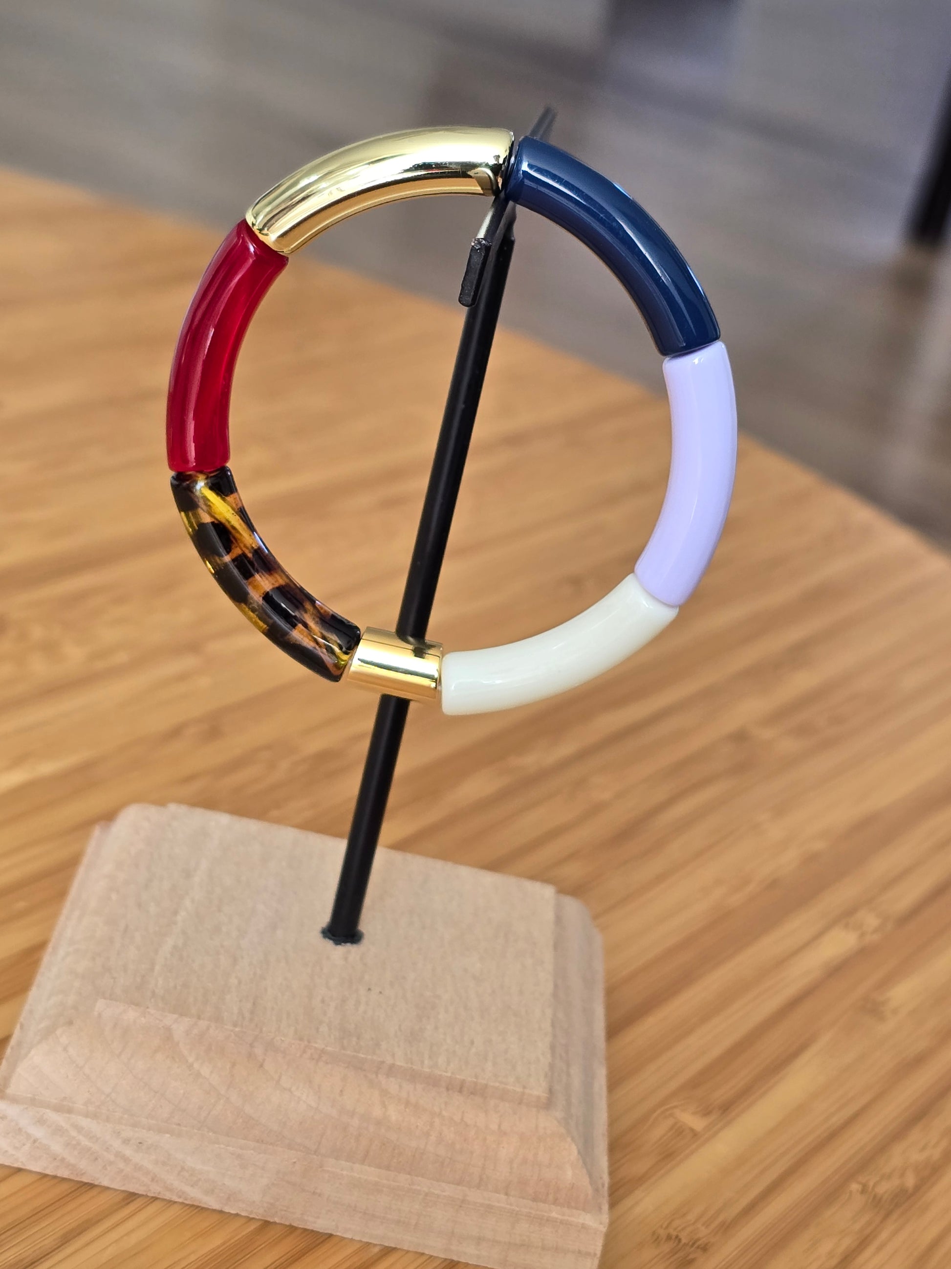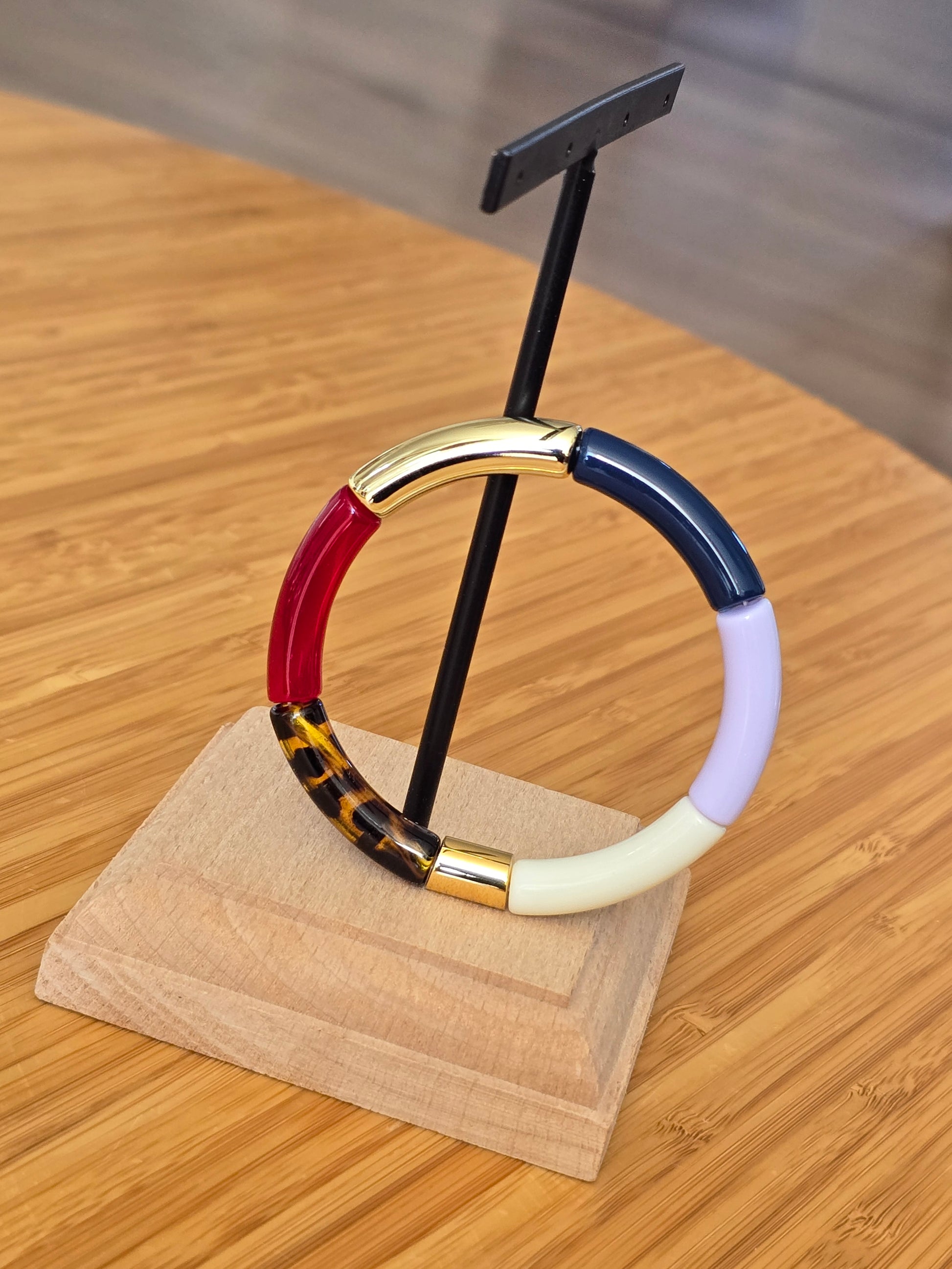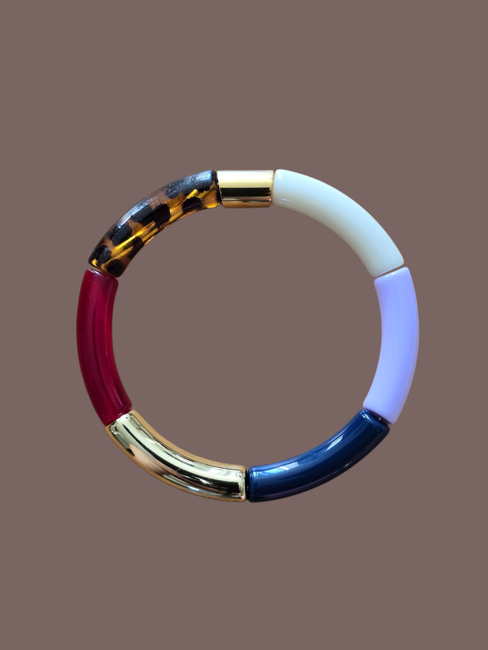 Les bracelets sont composés de 6 perles en acrylique et d'une perle gravée Lisso en acier doré.